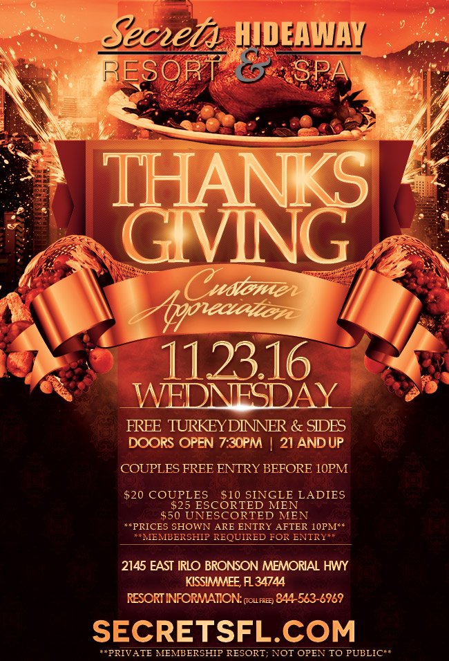 Secrets Hideaway would like to give thanks to all of you that have supported us. Tonight not only are we open, but we would like to have Thanksgiving dinner with you. You read that correctly. We want to show our members how much we appreciate you with a turkey dinner and sides. Please come out and celebrate with the Secrets HideawayTeam for Thanksgiving.