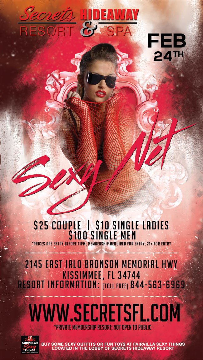 Tonight, Secrets Events is proud to present one of our sexiest themes – Sexy Net. This party is about SKIN and all the sexiest fabrics we can see on your bodies. Net wear is fun whether it’s on your legs or wrapped around your body in a sexy dress or top. Fishnets are always sexy, but tonight with all of the ladies running around in barely there “clothing”, it’s going to get erotic fast! Join us for another hot, hot, steamy night.