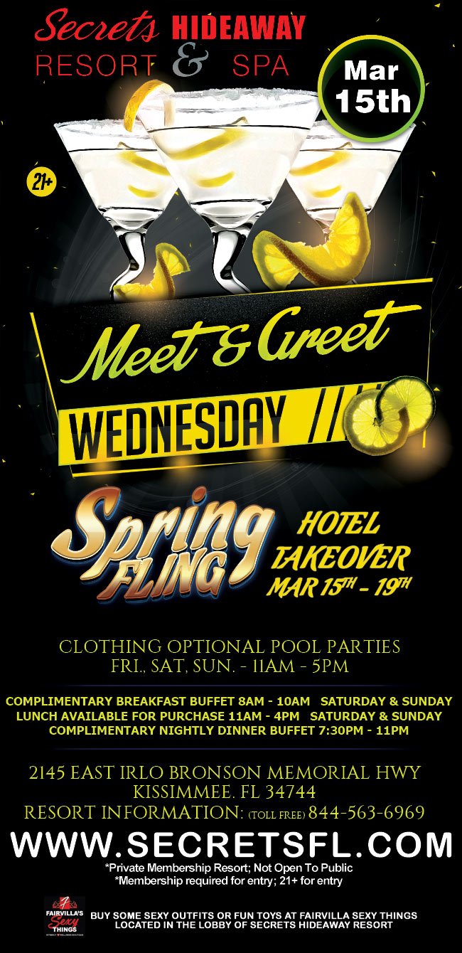 Winter is coming to an end and everyone is getting restless. Why not join Secrets Hideaway at our Spring Fling Hotel Takeover? A Spring Fling party is all about getting together your friends, eating some excellent food, having a few drinks, and cutting loose. This Hotel Takeover is packed full of events. Wednesday night is a Meet & Greet. On Thursday, make sure you check in, get your room, and make yourself right at home. Thursday night the fun begins with Newbie Thursday at Club Secret starting at 7:30PM.