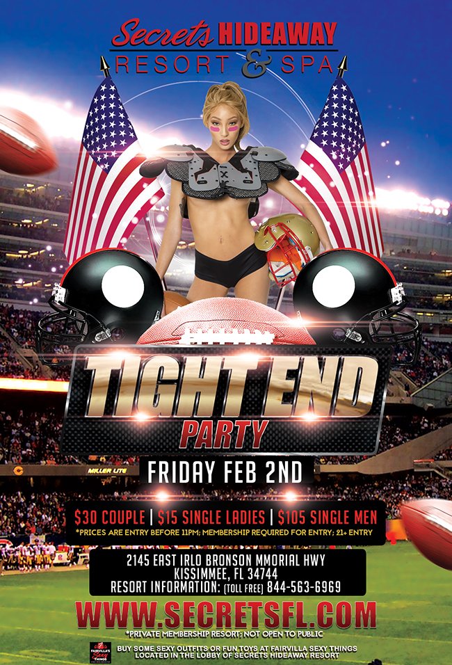 Join Secrets Hideaway as we host our Tight End Party. This time we will be dressing up in very little football outfits for you to show off your best ASSets. That’s right it's a Tight End party. So, wear booty shorts and pasties or body paint and less but make sure they have your favorite Football team worked into it. Come on show us what kind of team spirit you have. Lady Savannah’s Dungeon is available from 10pm-2am for a stimulating combination of Lifestyle and Kink.