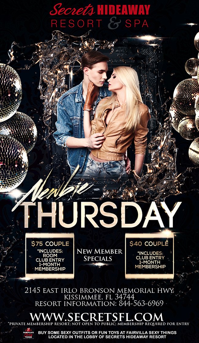 Thursday night begins at 7:30pm with Newbie Thursday. Tonight, we invite couples who have never experienced Secrets Hideaway to explore their wild side. You can purchase a 1-night membership and club entry for only $40. Want to stay the night? Please do. You can purchase a 1-night membership, club entry and a room for a mere $75. Make the night your own fantasy experience. Whether you want to soak in one of our hot tubs or get your groove on, Secrets Hideaway is the place for you.
