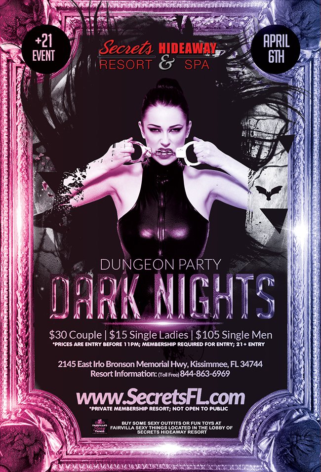 Have a secret??? Have a fetish??? Come to Secrets Hideaway tonight and share your deepest, darkest fantasy as we share our lighter side of Kink. Saturday is on fire as our Dark Nights Dungeon Party is kicking up ashes. Come dressed for a Kinky night as we celebrate our Kinkster and Swing Lifestyles coming together for a Hot night.  Lots of demonstrations both in the Dungeon and Club Secret, don't miss your chance to be tied up or enjoy a bit of a brush with the BDSM side of Spice.