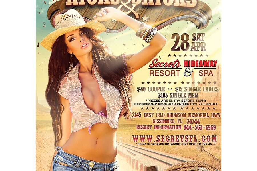 Evenin’ Partners. Mosey on over to Secrets Hideaway tonight for some down home country lovin’ during our Hicks & Chicks shindig. Kick up your heels to some boot stompin’ music. Our DJ will add a lil bit of country dance music to his hot mixin. Just imagine all those sexy cowgirls in Daisy Dukes and guys dressed in tight jeans and cowboy hats. Belly up to the bar, while you watch those country girls shaking their honky tonk badonkadonk on the dance floor. then head off to the playroom or maybe the hot tubs and heated conversation pool. Big and Rich were right when they sang “Save a Horse, Ride a Cowboy.” Lady Savannah’s Dungeon is available from 10pm-2am for a stimulating combination of Lifestyle and Kink.