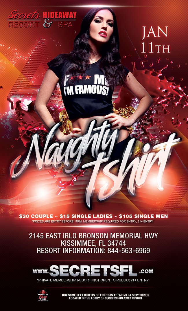 We know you’ve got them, and we want to see them. The dirtier the better, we want to see it all - your naughty t-shirts that is! Join us at Secrets Hideaway Resort and Spa and show us just how naughty you can be! Get creative and get ready for a sexy and hilarious evening of raunchy humor. Shock your friends, or get seductive, the choice is yours on this one-of-a-kind night! Clear your schedule now, this is one night you do not want to miss!