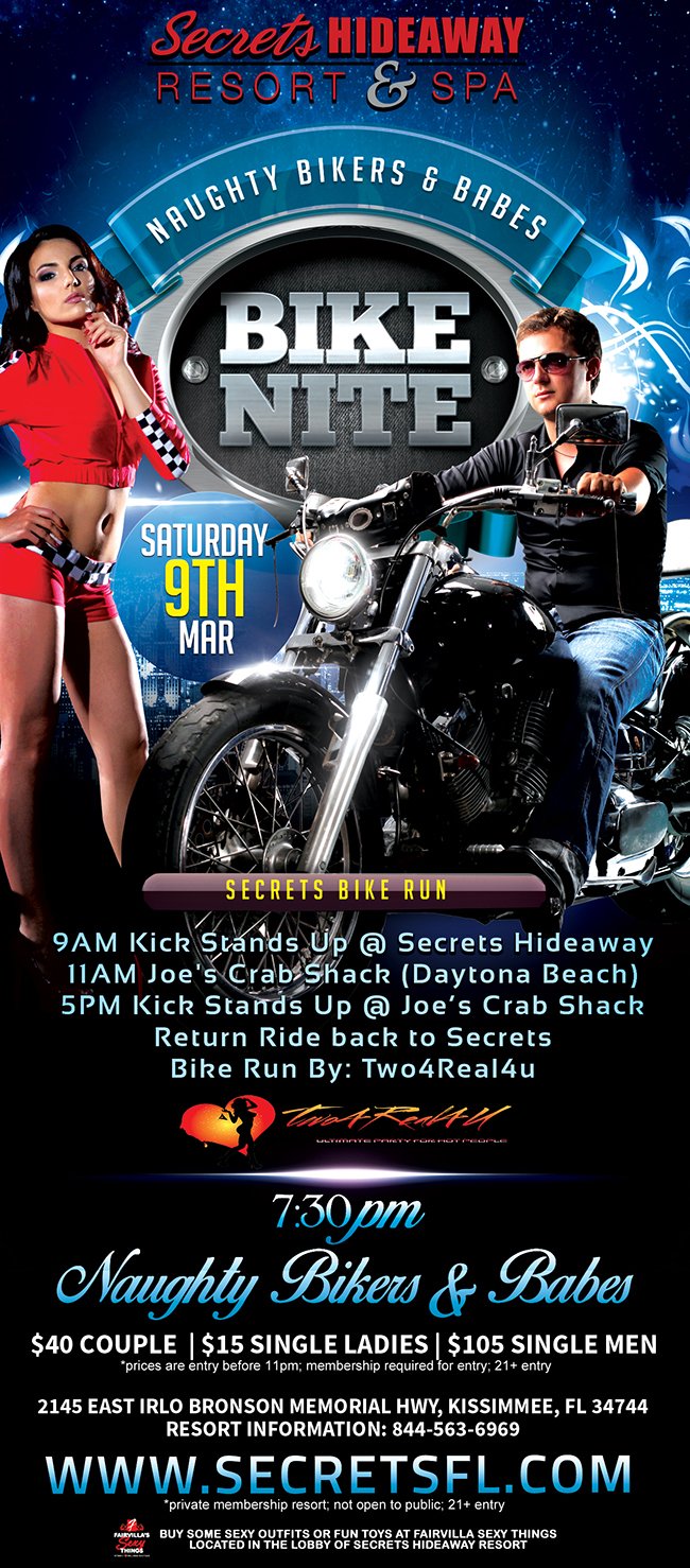 7:30PM Naughty Bikers & Babes – Join all the other naughty bikers and babes in Club Secret to continue the party! (Get to the club by 8:30PM to learn the Biker Shuffle with Robert & Christina).