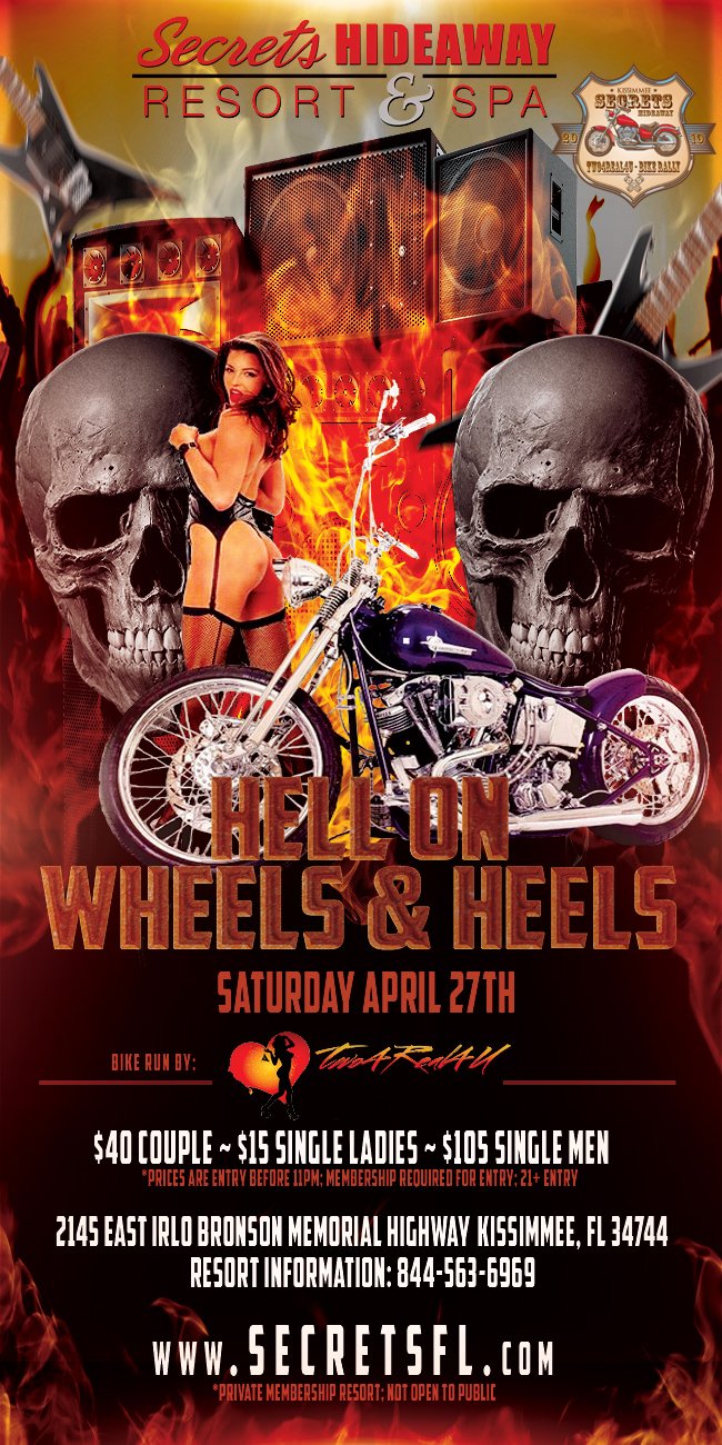7:30PM Hell on Wheels and Heels – Pull on your biker boots or slip into some sexy heels and rev those engines, then join all the other naughty bikers and babes in Club Secret to continue the party! (Get to the club by 8:30PM to learn the Biker Shuffle with Robert & Christina)