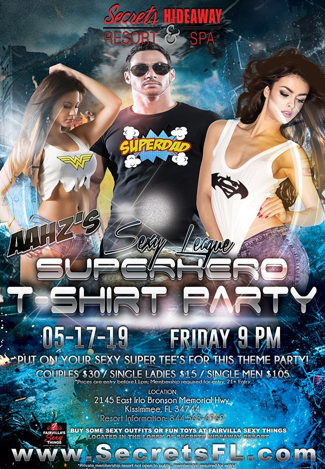 Tonight, let your chest do the talking! Whether you’re a super hero, a super villain, or a super slut we want to know and your t-shirt is going to be the one to tell us. Go retro with a tried and true hero, or get creative and show the world your own unique super power. You can come solo or create your own Justice League, but whatever you do, don’t miss this weekend at Secrets Hideaway Resort & Spa as we celebrate the superhero inside of us all!