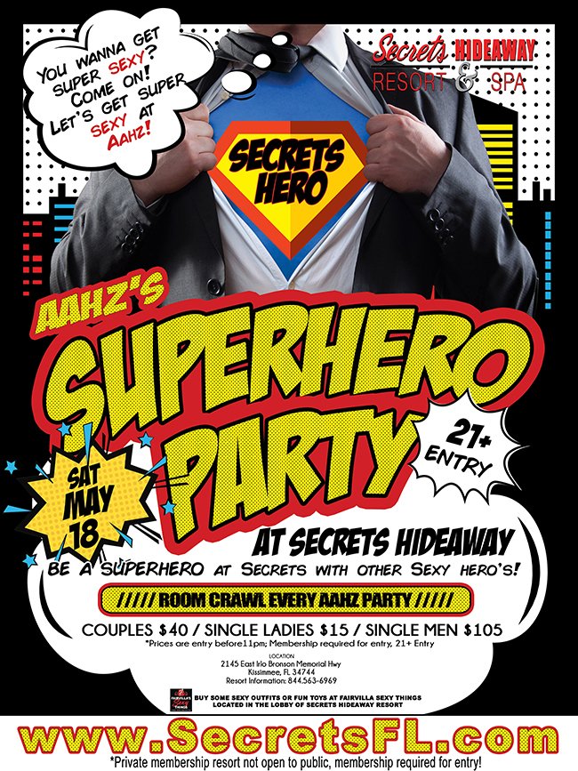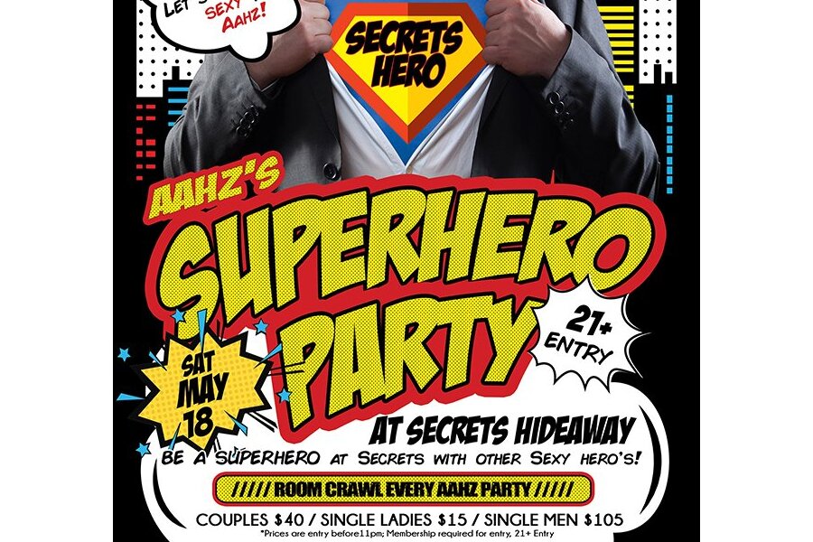 Get here early because the party starts at 6:00pm with the famous Aahz room crawl! Your sexy host couple will entice you with a heroic shot, and neighbors will be more than willing to swing into action. Mix and mingle, then head to the dining room for our complimentary dinner buffet. Club Secret opens at 7:30pm so grab a bite and get ready for a night you that will make the front-page news. With a huge dance floor, fully-equipped BDSM Dungeon and ample playrooms, you never know where the night may take you. The group shower is the perfect cool down after getting hot and sweaty, or get wet in one of our lavish hot tubs. The amenities are open until 4 am and there’s plenty of time to save the night. So only one question remains, what’s your super power?