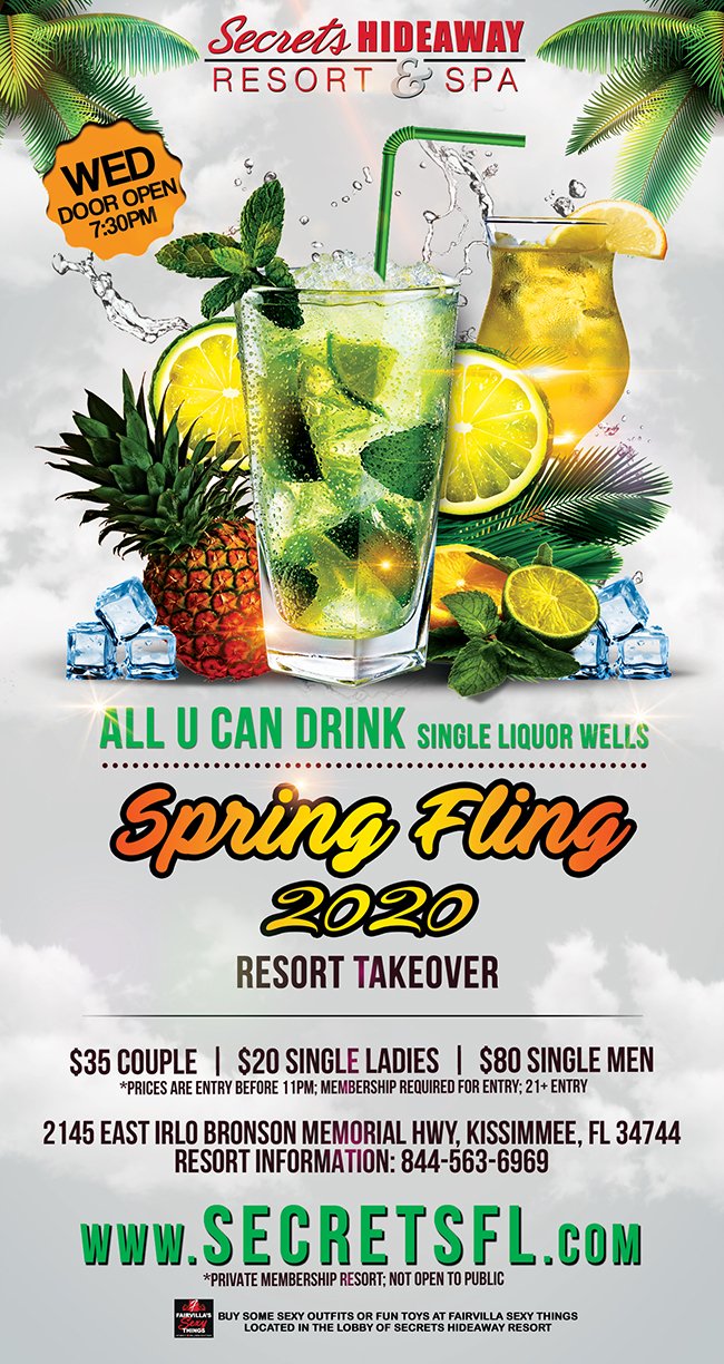 The days are getting longer and the nights are getting warmer so strip off your winter layers and head to Secrets Hideaway now for 5 days of Spring Fling excitement! It all starts tonight with our spring-inspired All U Can Drink Party at Club Secret! Get feverish on the dance floor while you sip endless cocktails and warm up to a fresh new season of playful parties that will tease your senses and inspire new naughty secrets to be made. Spring is the perfect time to come alive and renew your desire, and Secrets is the perfect place to blossom into a colorful new world of vibrant fantasies!