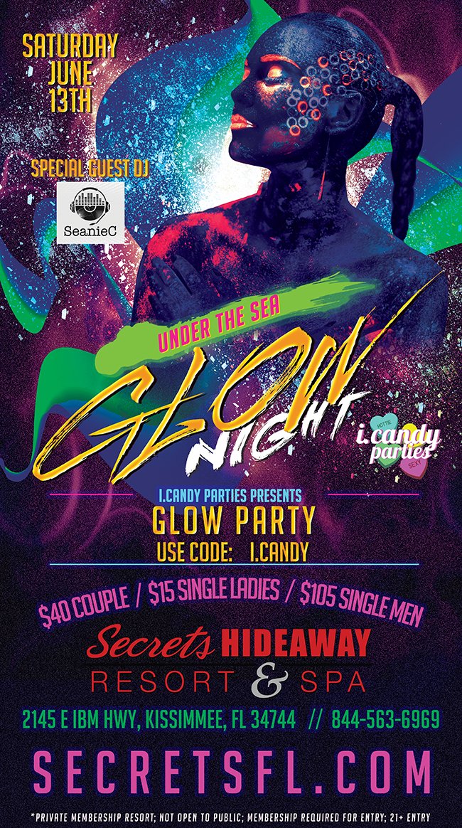 Secrets Hideaway Resort & Spa is proud to host iCandy Parties for their first ever COMPLETE HOTEL TAKEOVER! Join us tonight for a entirely OUTDOOR GLOW PARTY as we go Under the Sea for a clothing-optional experience like no other. Dive into your next adventure with glowing foam pools, VIP cabanas, outdoor dance floor & DJs, and plenty of naughty fun with all your sexiest friends! Glowing water nymphs and scantily clad goddesses will emerge from the deepest seas for this tantalizing affair, and this party goes all night long! So book your room now and don’t miss out on the tastiest glow party ever as iCandy comes to Secrets!