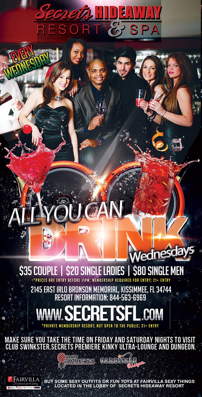 Only $35 for couples, $20 for single ladies, and $80 for Single Men takes care of club admission, access to the pools and playrooms, and keeps the drinks flowing all night long!