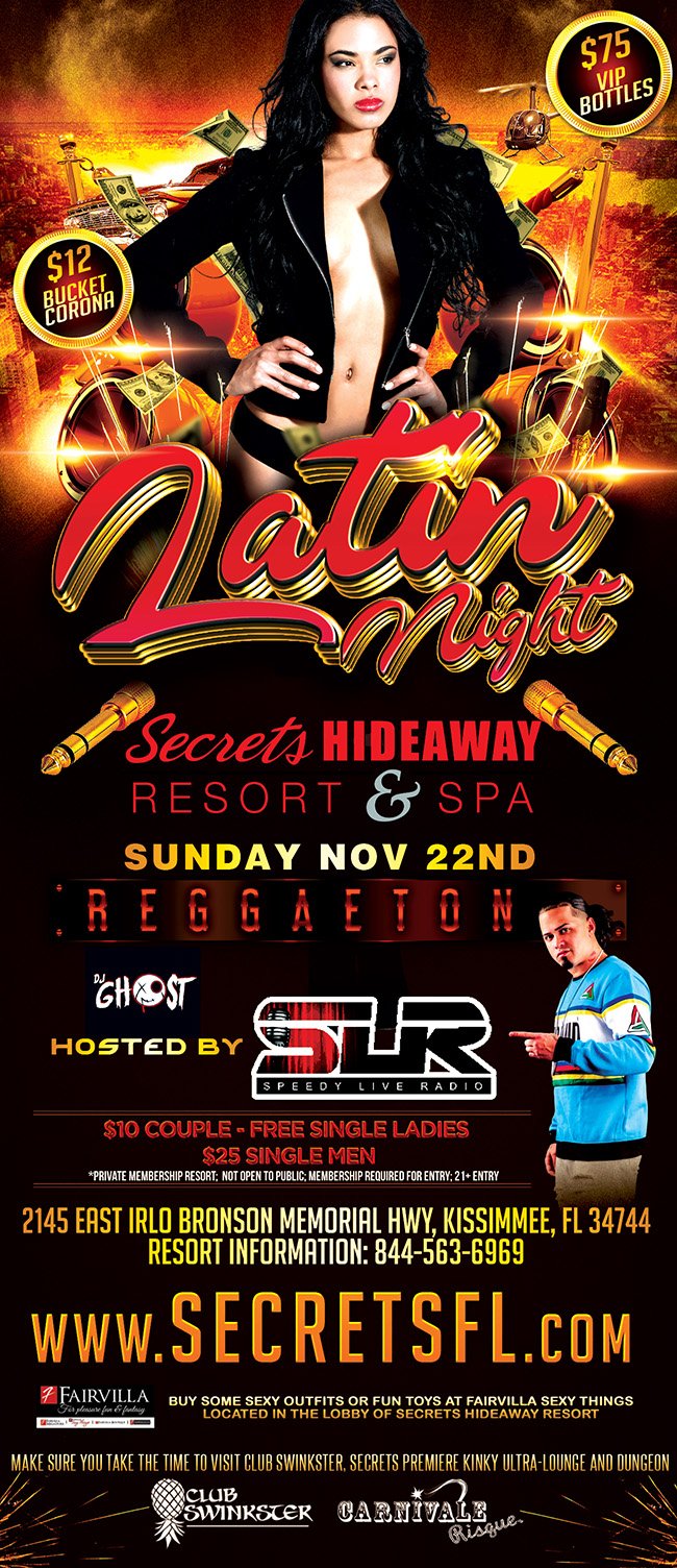 The mesmerizing grooves and tantalizing rhythms of Latin music have been leading people to the dance floor for decades! Tonight, get ready to heat things up at Club Secret as we spin the hottest Latin dance music and entice you onto the dance floor. Dress to impress and let the evening transport you to a tropical paradise where the party lasts all night! Your sexiest friends are waiting so don’t be late. It’s a fiesta like no other and your wildest secrets are just waiting to be made at Secrets! Free your inhibitions and join us for the hottest dance music, coldest drinks, sexiest friends, and wildest-times on the dance floor, or in the on-site playrooms and clothing optional pools / spas.