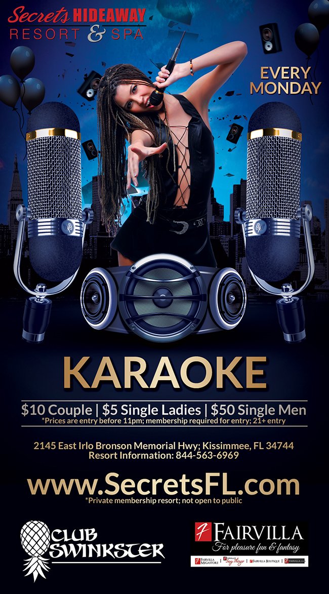 Join us for Karaoke Monday's!! This is a great night to have a couple of drinks and let your inner star shine. So, come on out, meet some sexy new friends, and enjoy all the skimpy outfits. Take the microphone in hand, sing your heart out and rock the night away. We’ve got your entire night covered with menu items available for purchase, starting at 6pm, and two pool-side bars. Take a dip in one of our two clothing-optional pools, or meet new friends in one of our indulgent hot tubs. Grab a few new accessories at our on-site boutique, Fairavilla’s Sexy Things. We offer multiple indoor playrooms where you can put on a show, meet new couples, visit our dungeon, and create your wildest fantasy!
