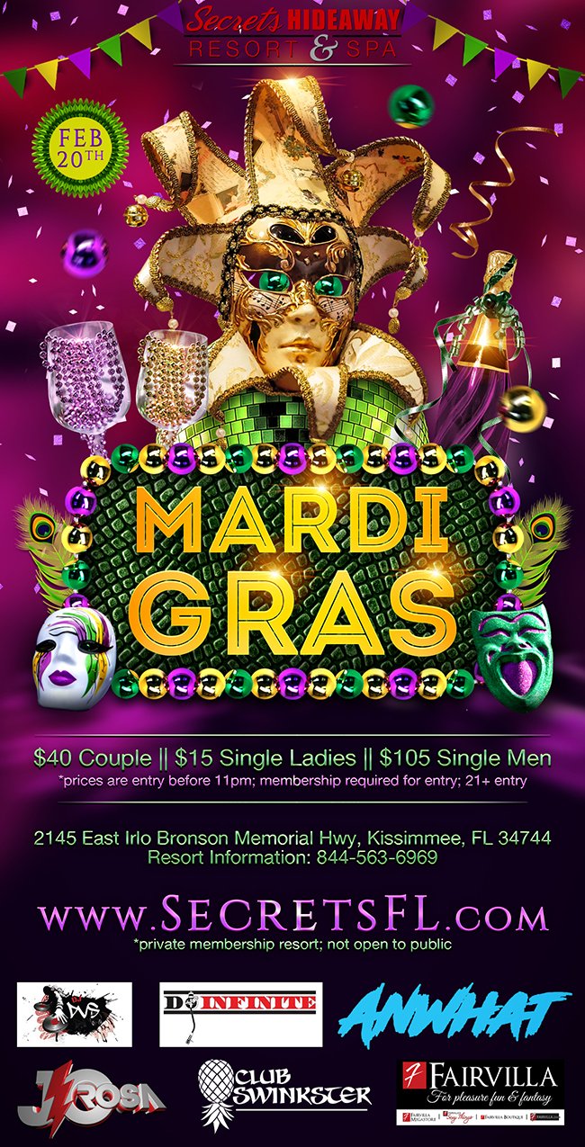 There’s no party like a Mardi Gras party and, if you can’t make it to New Orleans, there’s no better place to celebrate than at Secrets Hideaway Resort and Spa. Dazzle and shine this Saturday night as you join all your sexiest friends for fantasy filled evening of masqueraded merriment. Get ready to unmask your excitement and make some merriment for the biggest party in the nation. This Saturday night, we celebrate Mardi Gras, Secret’s style!