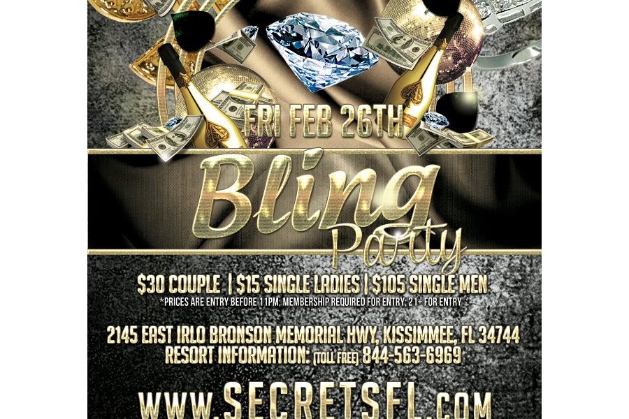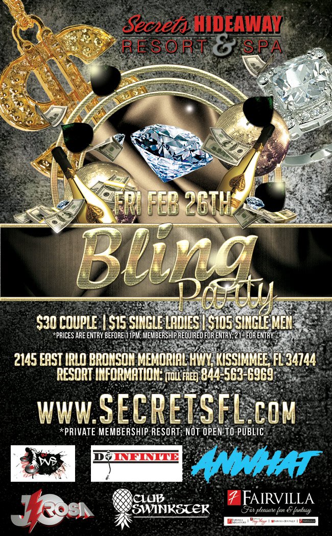 This Saturday Secrets Hideaway will be Blingin’!!! Ladies and gents, we want you to head on over to Club Secret for our Bling Party. Come and show off your BLING and meet some fun and sexy people. Wear your Diamonds, Rubies, Rhinestones and Gold! Maybe even some body Bling. Grab a drink from the bar and watch all the sparkling sexiness on the dance floor.