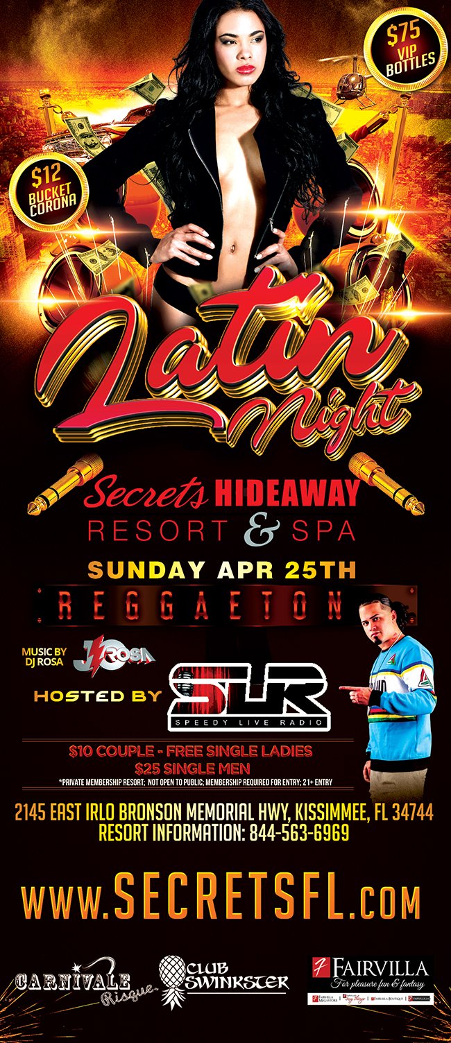 The mesmerizing grooves and tantalizing rhythms of Latin music have been leading people to the dance floor for decades! Tonight, get ready to heat things up at Club Secret as we spin the hottest Latin dance music and entice you onto the dance floor. Dress to impress and let the evening transport you to a tropical paradise where the party lasts all night! Your sexiest friends are waiting so don’t be late. It’s a fiesta like no other and your wildest secrets are just waiting to be made at Secrets! Free your inhibitions and join us for the hottest dance music, coldest drinks, sexiest friends, and wildest-times on the dance floor, or in the on-site playrooms and clothing optional pools / spas.