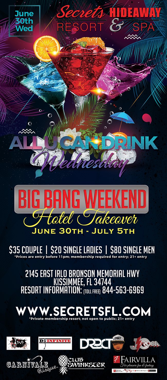Tonight, we kick off our Big Bang Resort Takeover with the most patriotic, All You Can Drink Party anywhere! Let freedom reign as the cocktails flow in endless abundance and your sexiest friends come together to celebrate the birth of this amazing country. It’s the biggest holiday of the summer and Secrets is proud to celebrate with the wildest Big Bang yet as this week folds into an explosive weekend of parties, friendship, and many sexy secrets to be made! Book your room now - the next 5 days will be an explosion of sight and sound as we celebrate freedom at Secrets Hideaway Resort & Spa!