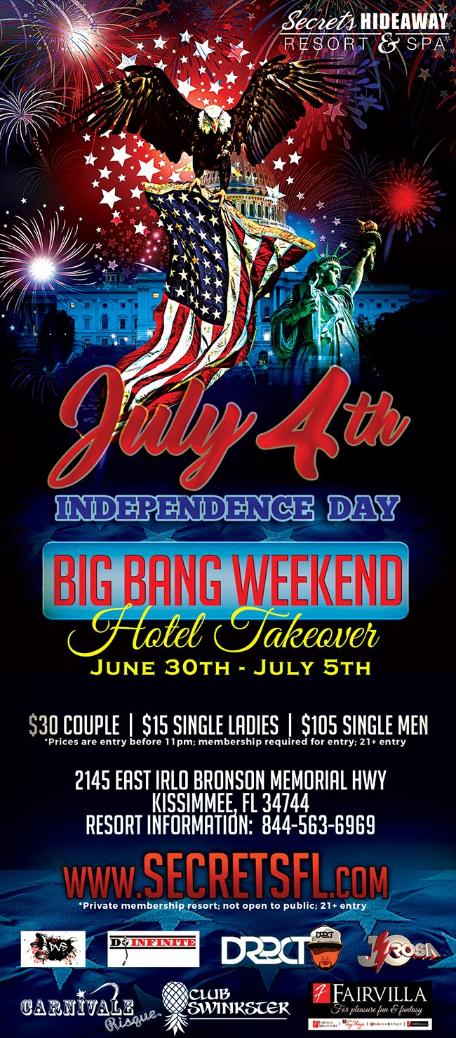 We’re having a party on the Fourth of July, there will be food and fun to put a sparkle in your eye. We hope that you’ll come and plan to stay, and party with us on Uncle Sam’s Birthday. He wants YOU to be at join Secrets Hideaway for the BIGGEST Independence Day celebration in the nation. With music, dancing, drinks, and all your sexy friends, tonight will be an event you don’t want to miss.