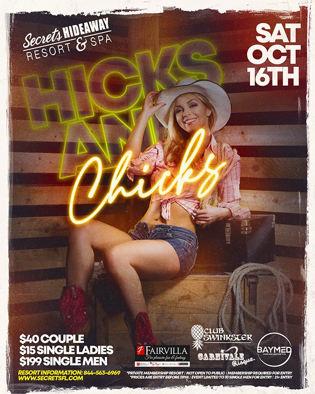 If there is anything hotter than a scantily clad cowgirl, it’s an equally bare cowboy! So, break out the denim and boots, we’re playing cowboys tonight at Club Secret! The rodeo is in town so lasso-up a flirtatious playmate and head to Secrets Hideaway Resort and Spa for a night of southern charm you won’t soon forget. Everyone loves a cowboy, so hit the dusty trail and make your way to Secrets this Saturday night for a celebration of everything down-home and sexy!