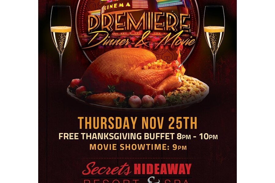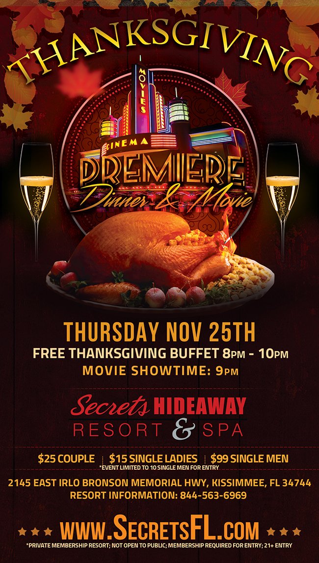 At Secrets Hideaway, our members are more like family, and what is the largest family gathering – Thanksgiving. Tonight, we want to share the love with our family by having Thanksgiving Dinner & a Movie! We would like to give a big THANK YOU to our members by kicking off the holiday season with a FREE Thanksgiving dinner buffet from 8pm-10pm in the club. At 9pm, it’s movie time. Join us as we transform Club Secret into a comfy space with couches and a “Big Screen” to watch your movie. Do something different this year and enjoy Thanksgiving with your Secrets family.