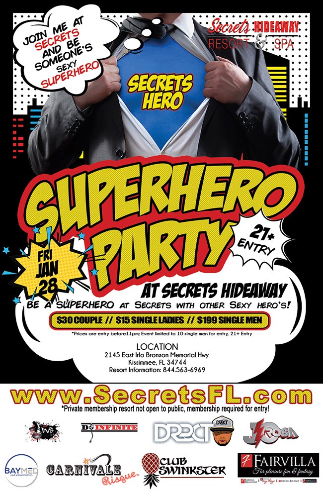 Everybody loves a man with a cape and there is nothing sexier than a lady in spandex, so tonight we celebrate all our sexiest hidden powers as we transform into super heroes. Come dressed in a classic, or create your own naughty alter ego, just don’t miss out on this fantasy party that is sure to reveal a few fun secrets.