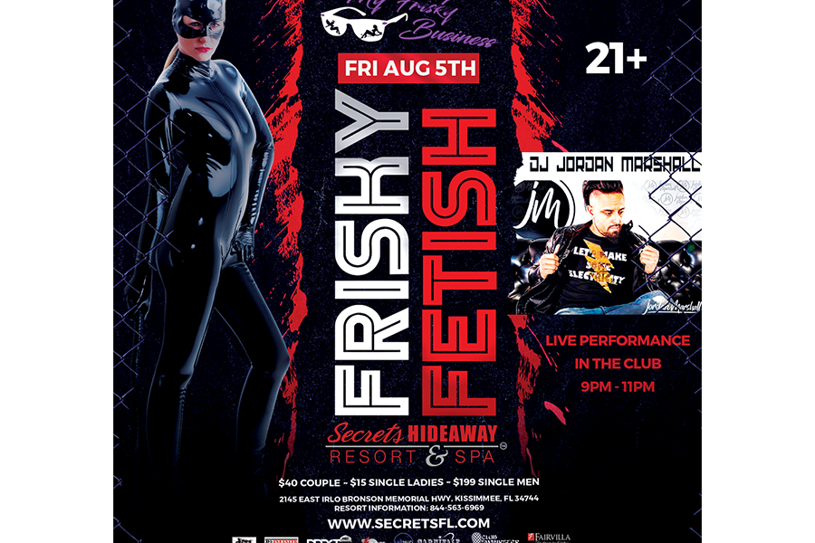 On Friday August 5th, we present our FRISKY FETISH party. If Whips & Chains excite you, get ready for one EROTIC evening.  Get out your Latex n Leather, Corsets n Fishnets, Collars, Cuffs n Chains…. Anything KINK goes!!!!