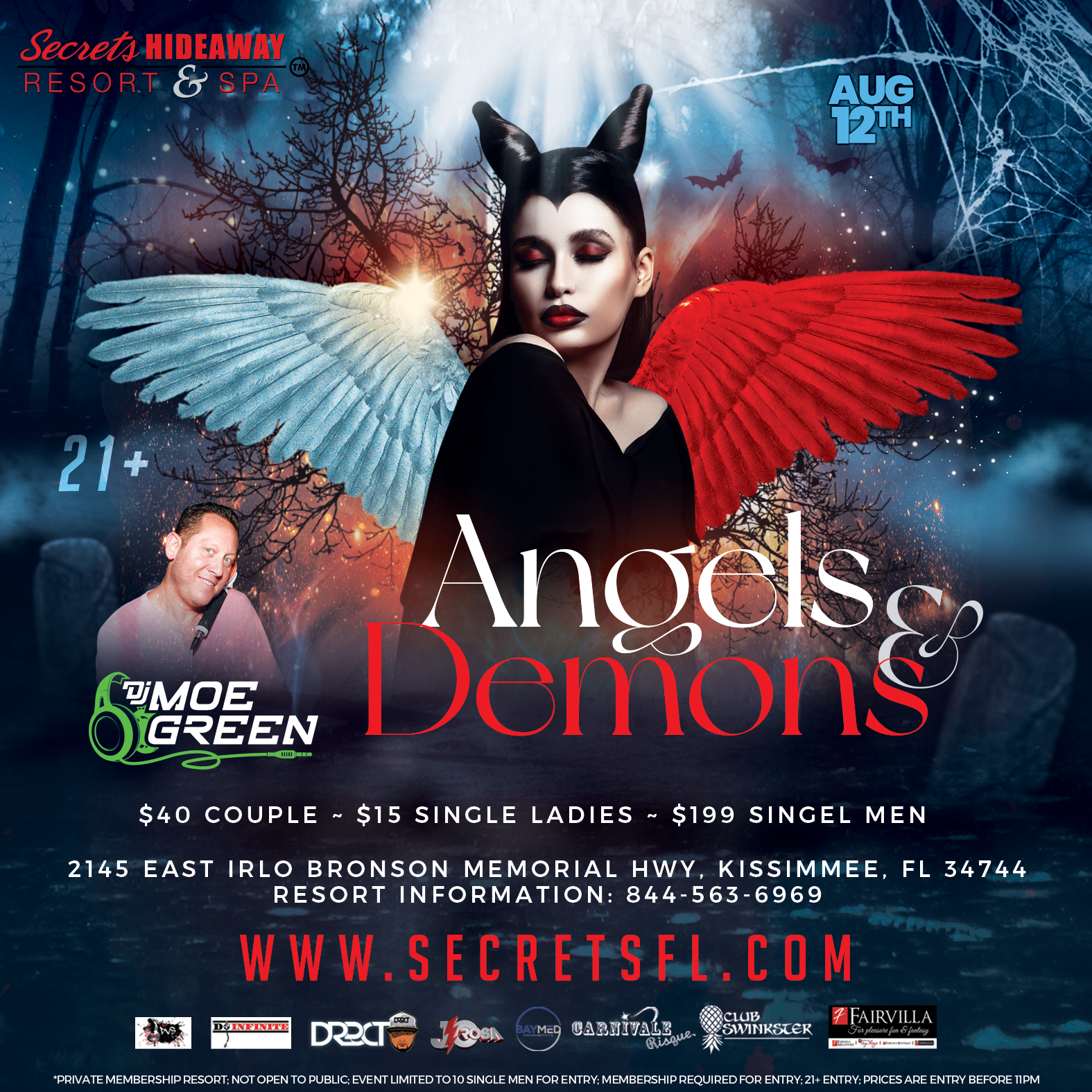 All the parties are located at Secrets Hideaway Resort & Spa®. For reservations: Visit our reservations page Click here for Reservations , call 844-563-6969 or book by clicking the Red "Book a Room" button at the top of each event page.