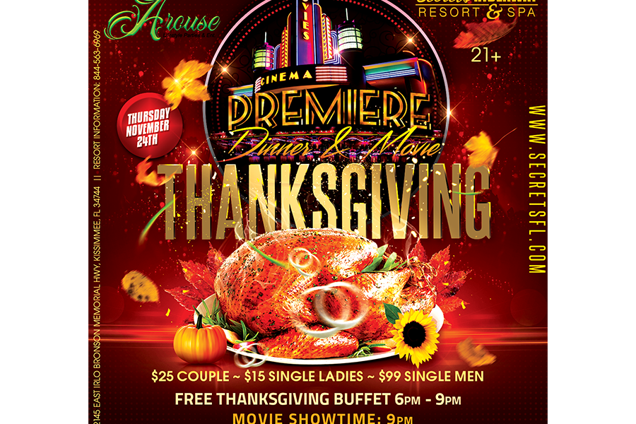 At Secrets Hideaway™, our members are more like family, and what is the largest family gathering – Thanksgiving. Tonight, we want to share the love with our family by having Thanksgiving Dinner & a Movie! We would like to give a big THANK YOU to our members by kicking off the holiday season with a FREE Thanksgiving dinner buffet from 6pm-9pm in the club. At 9pm, it’s movie time. Join us as we transform Club Secret® into a comfy space with couches and a “Big Screen” to watch your movie. Do something different this year and enjoy Thanksgiving with your Secrets family.