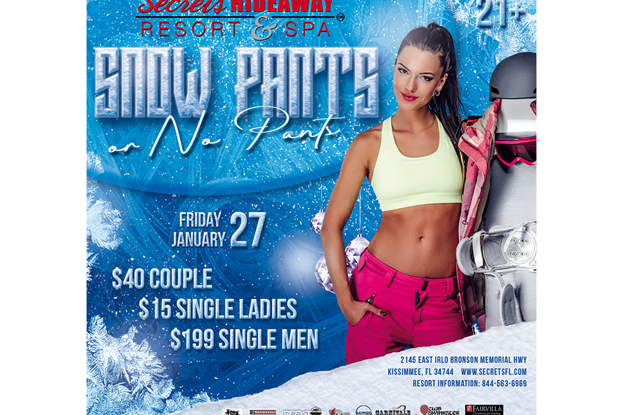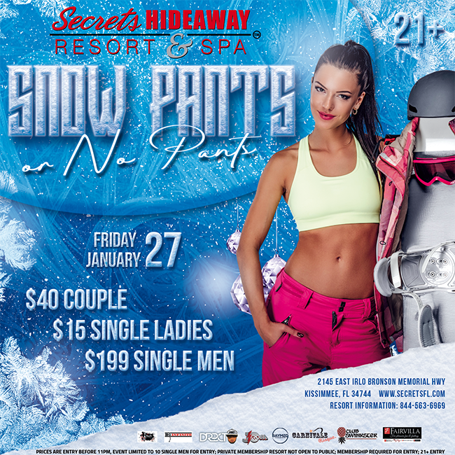 Because no one likes pants anyway and there is no snow in Florida, tonight at Secrets Hideaway™ we go pantless! Wear snow pants or wear no pants, the choice is all yours but we personally hope you opt for comfort because tonight we want to see you rock your panties! From thong to lace and everything in between - nothing says a night at Club Secret® like leaving your pants in the car. But the fun isn’t just for ladies, fellas - we want to see you strip down too! Boxers, briefs, or sexy “manties” - grab a pair and melt the snow as we strip down and bare all for a steamy Friday night bash like no other!