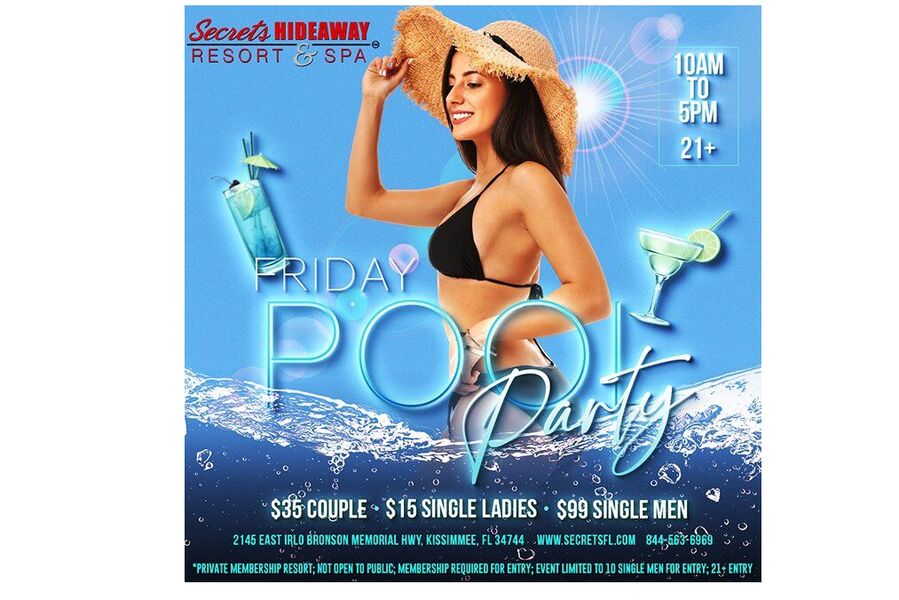 Join us at Secrets Hideaway Resort & Spa™ and celebrate the weekend at Orlando’s hottest clothing-optional pool party! Why wait to start the weekend fun? Starting at 10am we’ve got cold drinks at our tiki bar, a full lunch and dinner menu, and a professional DJ to play all your favorite songs. Rent a cabana and enjoy 8 hours of comfy luxury to get close and intimate with your favorite friends!