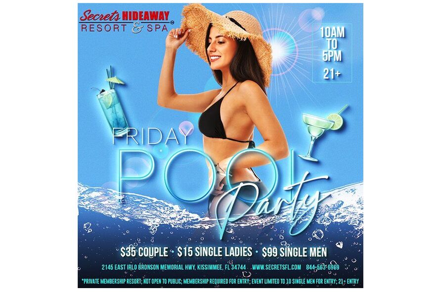 Join us at Secrets Hideaway Resort & Spa™ and celebrate the weekend at Orlando’s hottest clothing-optional pool party! Why wait to start the weekend fun? Starting at 10am we’ve got cold drinks at our tiki bar, a full lunch and dinner menu, and a professional DJ to play all your favorite songs. Rent a cabana and enjoy 8 hours of comfy luxury to get close and intimate with your favorite friends!