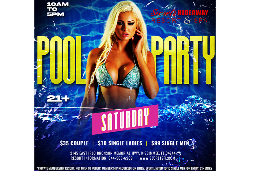 Celebrate Saturday in the sexiest way possible at Secrets Hideaway’s clothing-optional pool party! The weather is hot, so come strip down and cool off poolside. Join all of your sexiest friends at Secrets Hideaway Resort and Spa for a day in the sun, drink in hand, hot music, and even hotter friends. Our courtyard pool area and two outdoor tiki bars are the perfect location to let loose, be free, and celebrate summer!