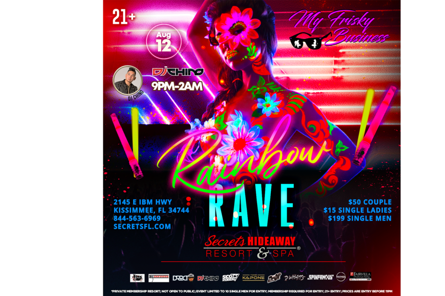 One of those most erotic sights is bare skin, glowing in the moonlight. Tonight, My Frisky Business recreates that fantasy with a Rainbow Rave GLOW party you don’t want to miss! We want to see your shimmery, glimmer-y, iridescent body in black light, so join your friends at Club Secret® for the sexiest glow party in the industry! The dance floor will transform into a luminescent sea of sensuality, as the DJs rocks hottest music, and the bartenders keep the drinks coming all night long.