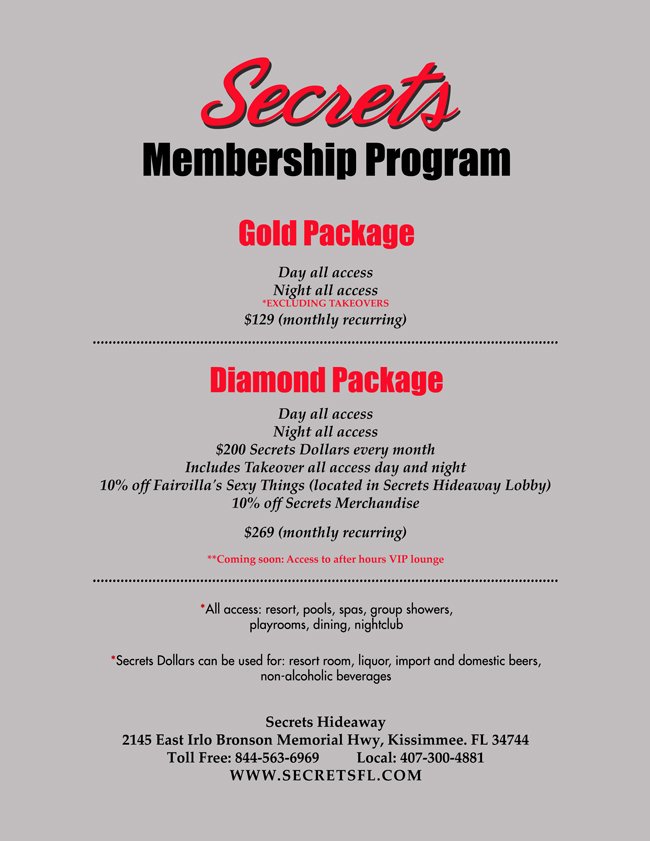 Ladies, we know you like to have a great time, so what better way to make that happen than to come out to a Wednesday Ladies Night. Heighten your anticipation for the weekend by grabbing a drink and taking a spin around the dance floor. On Wednesdays ladies enter FREE all night and drink FREE until 11PM. Secrets Events also has a very special treat for you. We have a male dancer from 10-2 for your viewing pleasure. He does everything from lap dances to pole dances. He may even give a pole dance lesson or two. We haven’t for gotten about that special man in your life. When you are escorted, his entry is only $15, and unescorted men are HALF PRICE!!! Guys, bring your ladies out for a night of dancing, drinks, and sexy fun. She will “Thank you” later .
