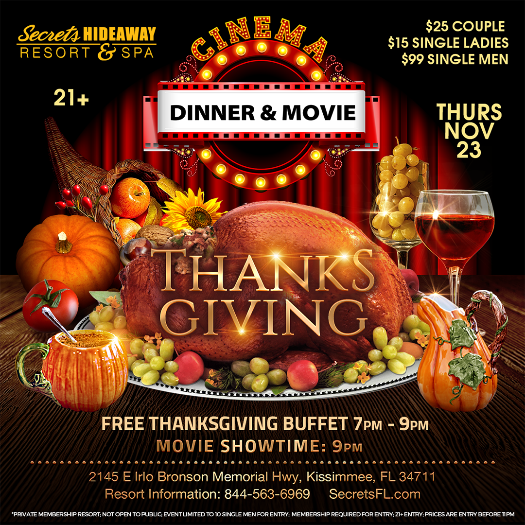 At Secrets Hideaway, our members are more like family, and what is the largest family gathering – Thanksgiving. Tonight, we want to share the love with our family by having Thanksgiving Dinner & a Movie! We would like to give a big THANK YOU to our members by kicking off the holiday season with a FREE Thanksgiving dinner buffet from 7pm-9pm in the club. At 9pm, it’s movie time. Join us as we transform Club Secret into a comfy space with couches and a “Big Screen” to watch your movie. Do something different this year and enjoy Thanksgiving with your Secrets family.