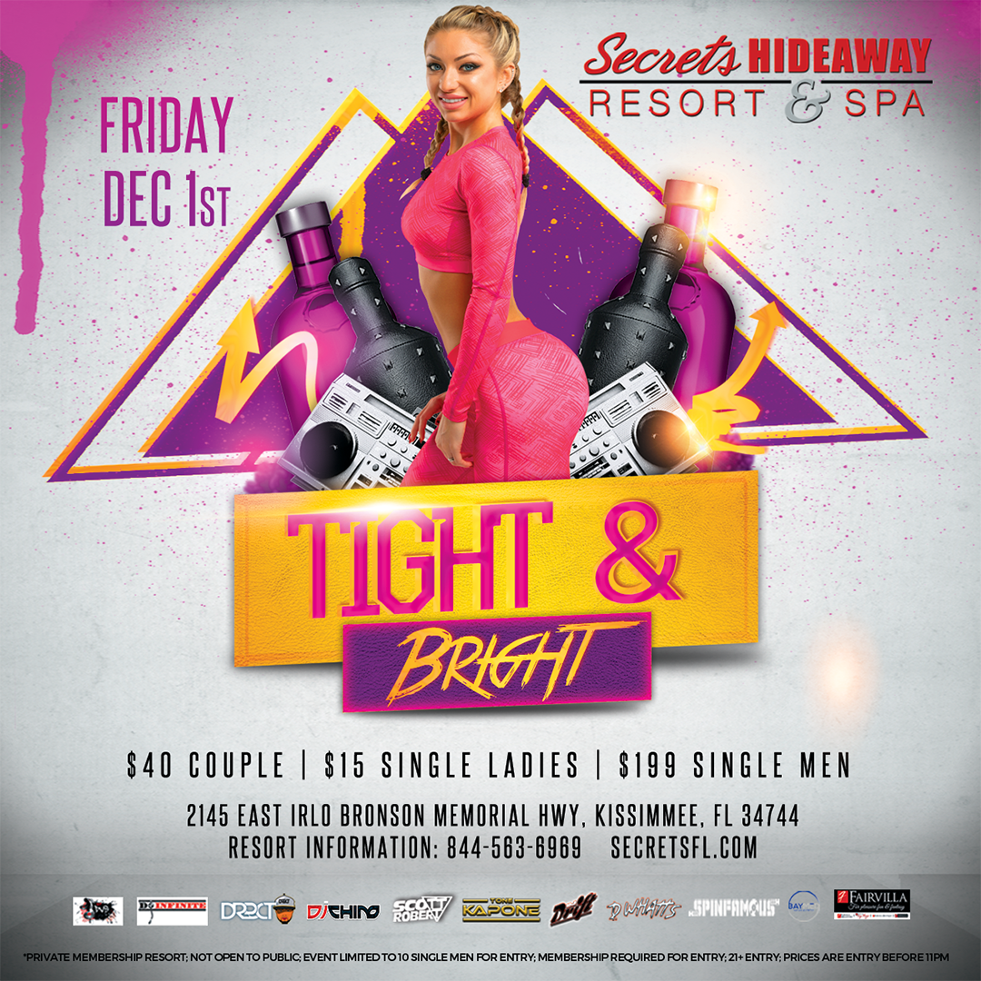 Tight & Bright are perfect for tonight as we wrap up two of our favorite trends into one extremely sexy party! Join us at Secrets Hideaway Resort and Spa for a radiantly revealing night of fabulous fun! Meet your friends at Club Secret as the dance floor transforms into a dazzling sea of vivid sensuality. Our DJs are ready to spin the hottest music and our bartenders will keep the drinks flowing all night long. We’ve set the scene and we are ready to play, so grab your friends and get ready to make some sexy secrets you won’t soon forget!