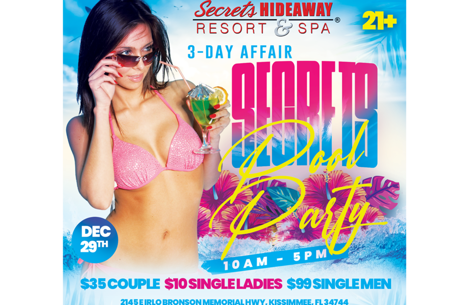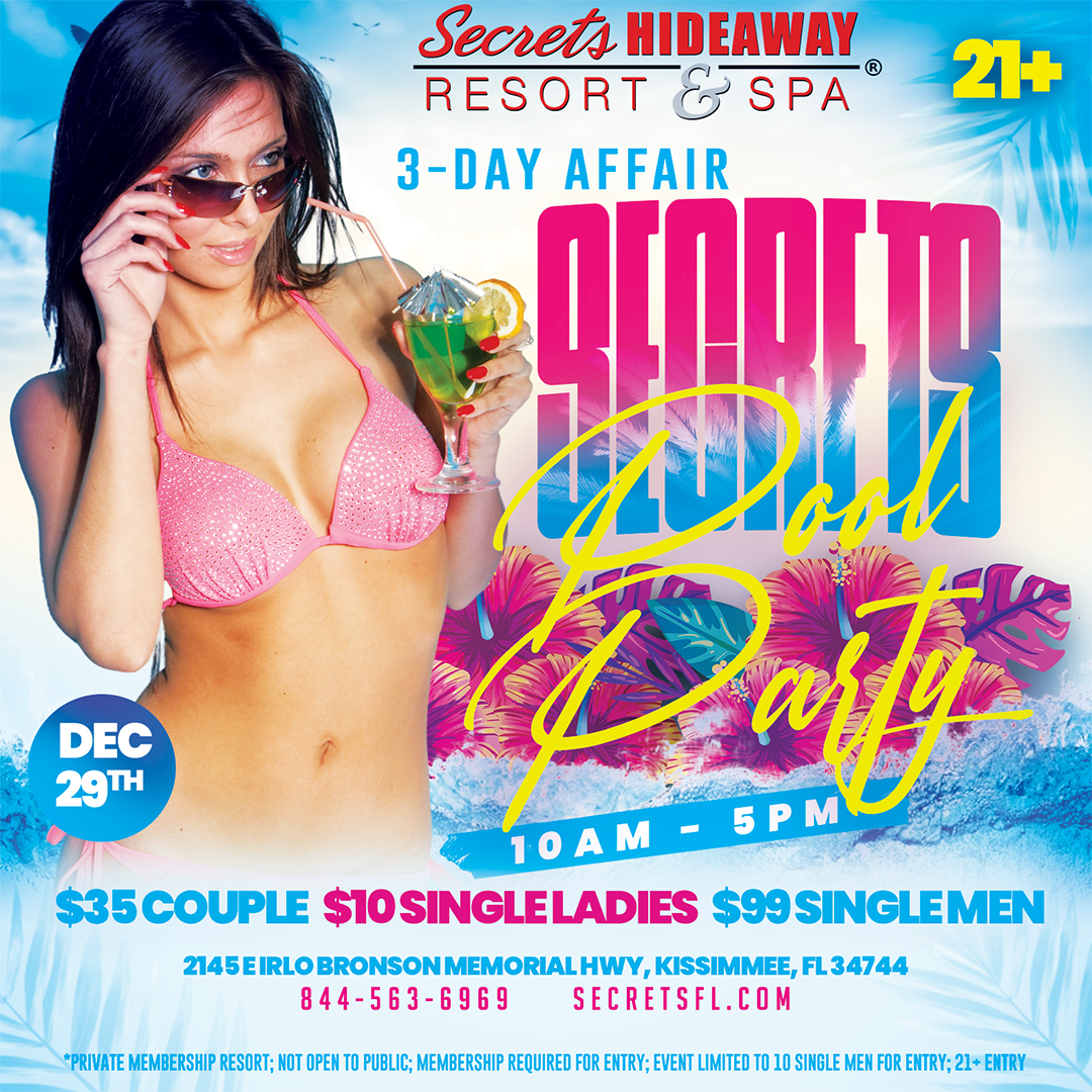 Join us at Secrets Hideaway Resort & Spa® and celebrate the end of another fantastic year at Orlando’s hottest clothing-optional pool party! Why wait to start the NYE fun? Starting at 10am we’ve got cold drinks at our tiki bar, a full lunch and dinner menu, and a professional DJ to play all your favorite songs.