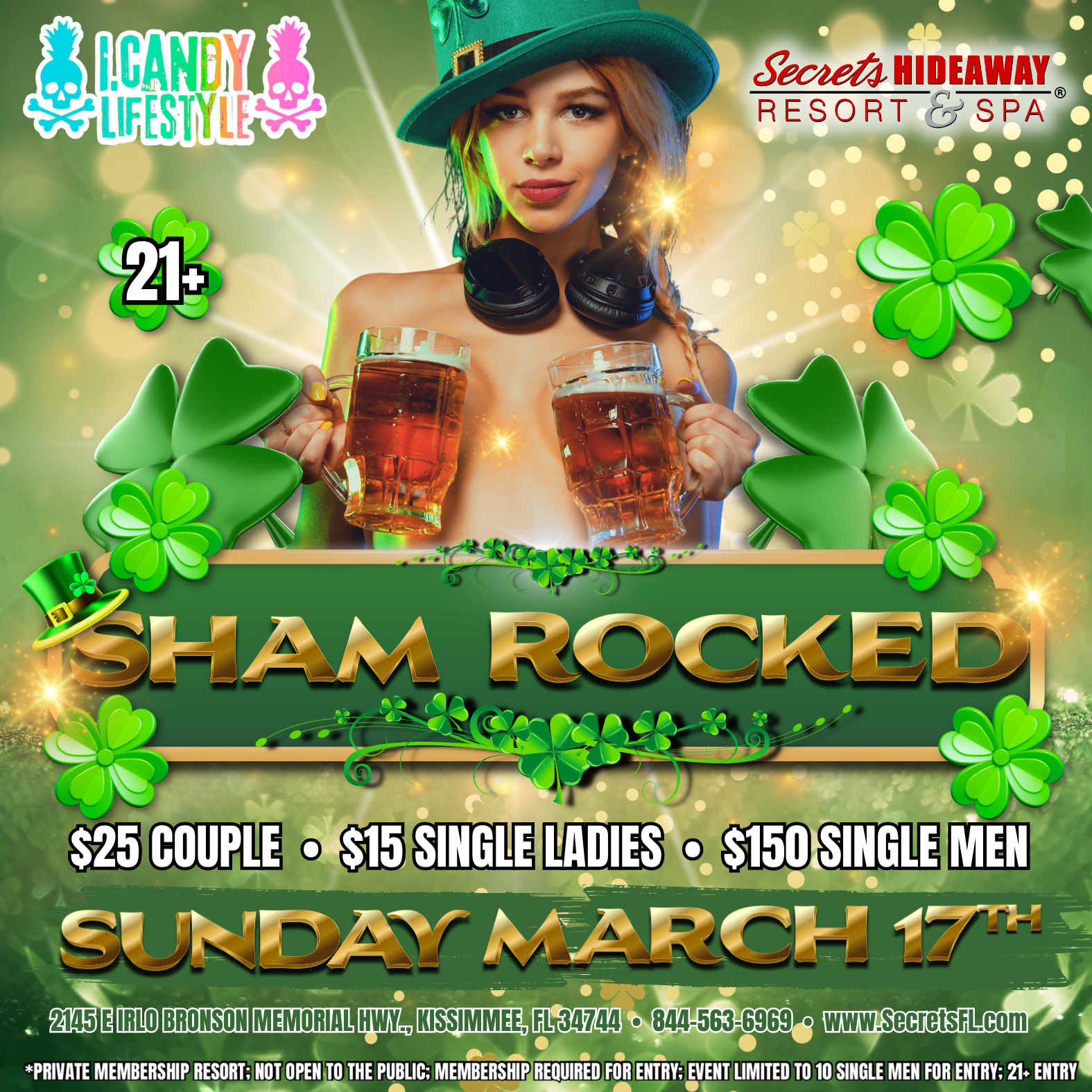 SUNDAY, MARCH 17th Prepare to get "Sham Rocked" at the grand finale of the Cirque' De Candy Takeover weekend! Join us for an incredible day and night of festivities on Sunday, March 17th, starting at 10am with the "Go Green" St. Patrick's Day Pool Party at Secrets Hideaway in Kissimmee, Florida. Get ready to embrace the luck of the Irish as we celebrate St. Patrick's Day in style. Indulge in green beer and green drinks that will be flowing all day and all night, ensuring a festive and vibrant atmosphere. With DJs spinning energetic beats and Irish performers captivating the crowd, the party will be in full swing both indoors and outdoors, creating an unforgettable experience for all. Hosted by i.Candy Parties, "Sham Rocked" promises to be a sensational event that will keep you entertained from morning till late into the night. Whether you're enjoying a refreshing dip in the pool, dancing to the rhythmic tunes, or being mesmerized by the Irish performers, there will never be a dull moment. So mark your calendars, put on your finest green attire, and join us for this incredible send-off to the Cirque' De Candy Takeover weekend. Get ready for a day filled with joy, laughter, and a whole lot of Irish luck!