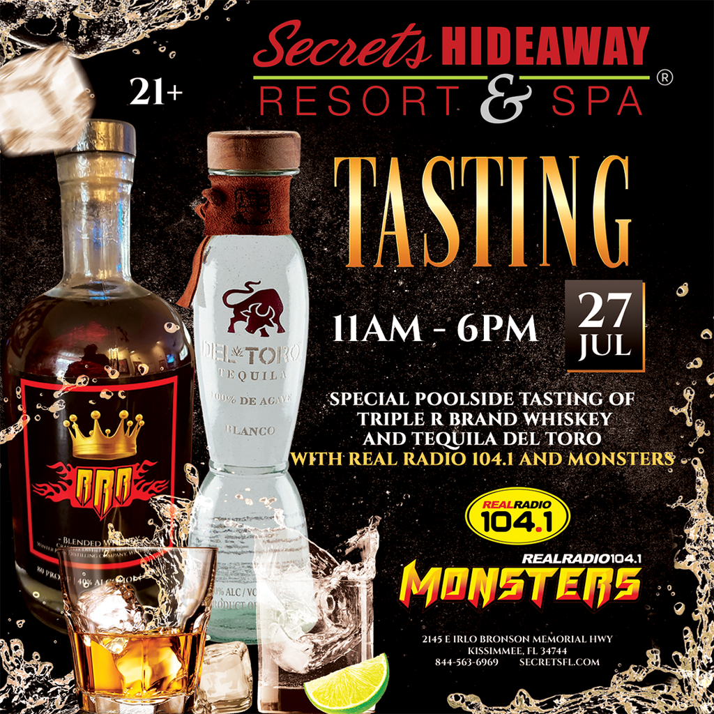 Secrets Hideaway is excited to host RealRadio 104.1's Monsters in the Morning for a special poolside tasting of Tripple R brand whiskey and Tequila Del Toro on Saturday, July 26th from 11am - 6pm. Join Monsters, Russ Rollins, and the Secrets crew for a day of sexy poolside fun and great drinks.