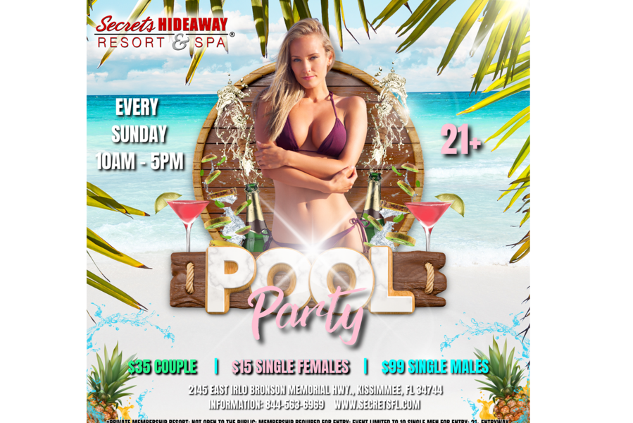 Get ready to indulge in the epitome of Saturday bliss at Secrets Hideaway's exclusive Saturday Pool Party, held every Saturday from 10 am to 5 pm. Shed your inhibitions along with your clothes and immerse yourself in the epitome of sensual freedom at Orlando's hottest clothing-optional pool event. With the sun beaming down and the temperature rising, Secrets Hideaway invites you to strip down, cool off, and join your sexiest friends for a day of pure, unadulterated pleasure. Picture yourself lounging poolside, drink in hand, surrounded by the rhythmic beats of hot music and the sizzling presence of even hotter friends. Secrets Hideaway Resort and Spa's courtyard pool area, complemented by two outdoor tiki bars, forms the perfect backdrop for this seductive rendezvous, where you can let go, be free, and celebrate the heat of summer in the most alluring way possible.