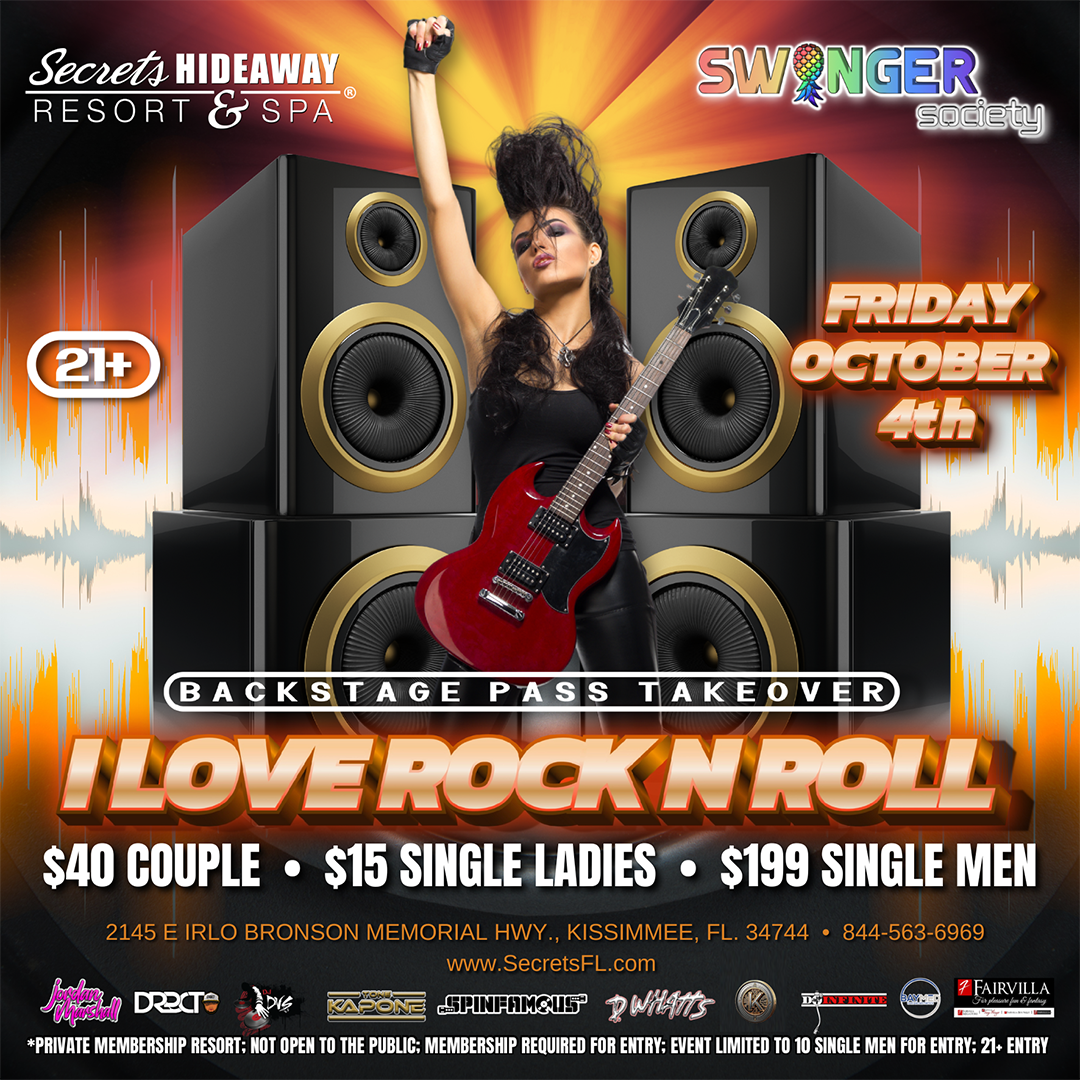Get ready to rock and roll all night long at the "I Love Rock N Roll" event presented by Swingers Society, happening on Friday, October 4th at Secrets Hideaway. This electrifying affair invites attendees to immerse themselves in the timeless rhythms and rebellious spirit of rock music, creating an atmosphere where passion, energy, and excitement collide on the dance floor. Whether you're a hardcore rocker or just love to groove to the beat, this event promises an unforgettable night of music, dancing, and uninhibited fun in the company of like-minded individuals.