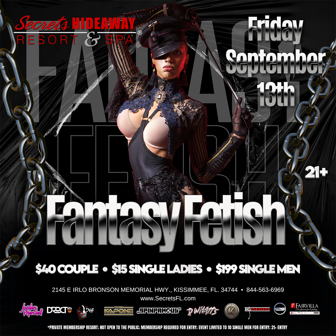 Get ready to unleash your inner desires at Secrets Hideaway's "Fantasy Fetish" event on Friday, September 13th. Dive into a world of BDSM, kink, spankings, and flogging as you indulge in an evening dedicated to exploring your deepest fantasies. Whether you're a seasoned practitioner or new to the scene, this event welcomes all to explore the realms of pleasure and pain in a safe and consensual environment.