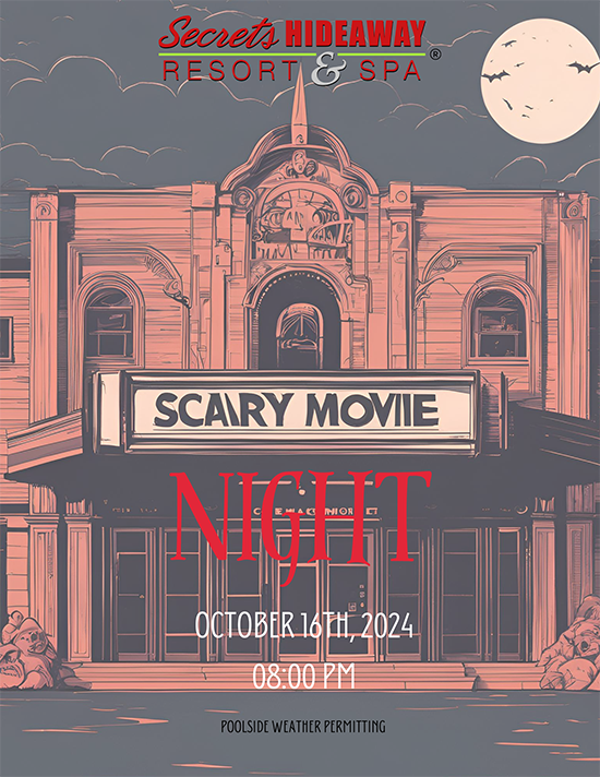 Join us poolside tonight for a thrilling Scary Movie Night under the stars! At 8pm, get ready to dive into a night of suspense, chills, and spooky fun as we screen a hair-raising movie that’s sure to keep you on the edge of your seat. Grab your favorite drinks, cozy up with friends, and prepare for an evening of eerie entertainment in the perfect outdoor setting.
