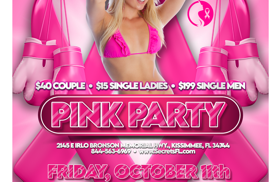 Join us at Secrets Hideaway on Friday, October 11th, as we host our annual "Pink Party" event in support of Breast Cancer Awareness. This special evening is dedicated to raising awareness and funds for those affected by breast cancer, and we invite you to join us in showing solidarity with survivors and honoring the memory of those who have lost their battle. Dress in your finest shades of pink and join us for a night filled with compassion, community, and celebration.