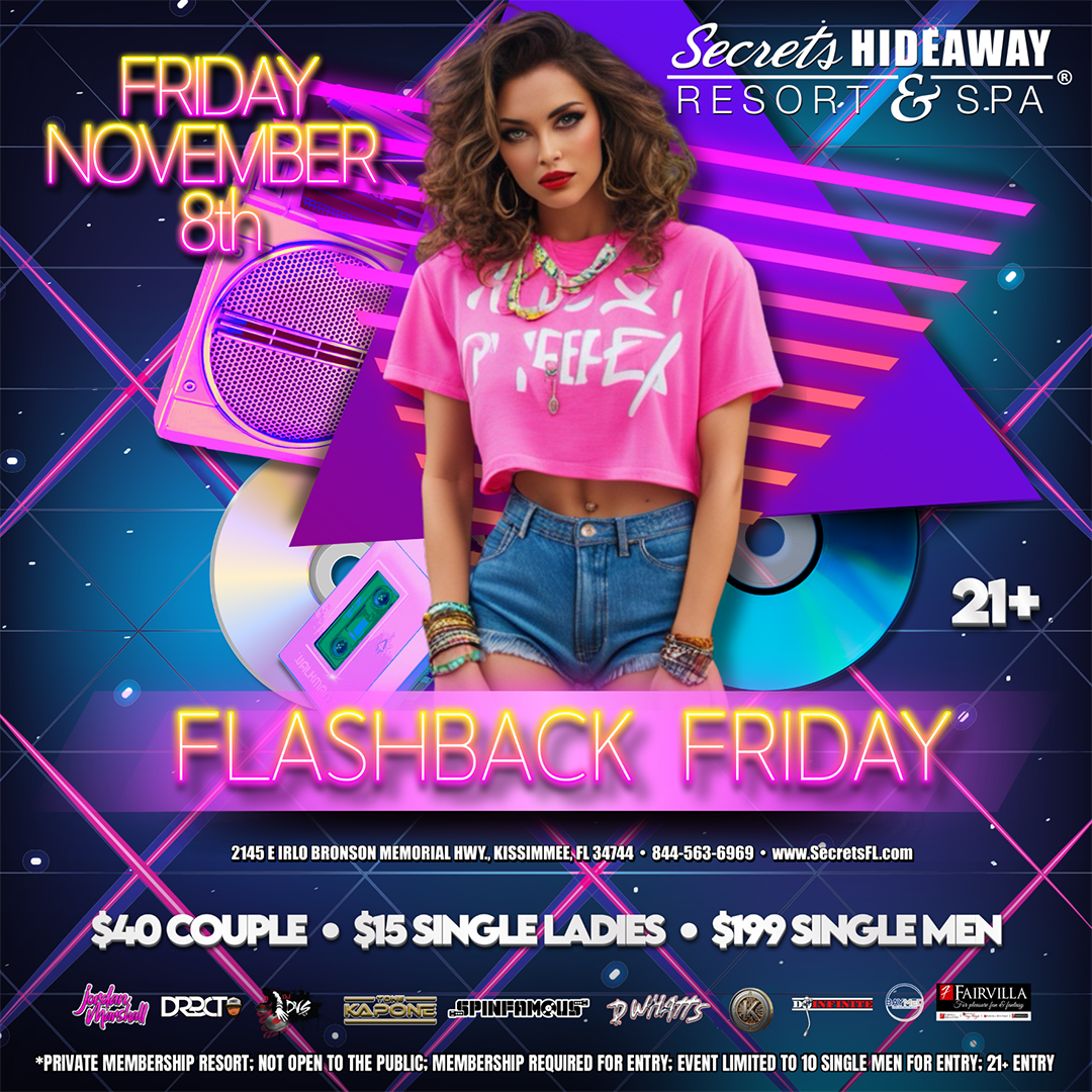 Secrets Hideaway presents "Flashback Friday" on Friday, November 8th! Do you remember the sexy 80s? Tonight, we’re taking a trip down memory lane, bringing back the era of neon lights, big hair, and irresistible dance beats. Dust off your leg warmers, tease up your hair, and slide into your best retro outfit as we relive the most iconic decade of all time.