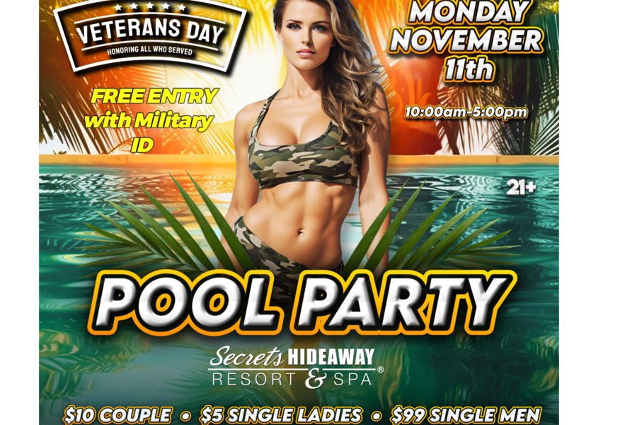 Join us for a day of relaxation and celebration under the sun. Dive into our refreshing pools, enjoy the vibrant atmosphere, and let loose with like-minded individuals. With top DJs spinning the hottest tracks, poolside bars serving your favorite drinks, and a community that appreciates our heroes, this event promises to be a memorable day of fun and camaraderie. Come and enjoy the ultimate pool party experience as we honor our veterans at Secrets Hideaway.