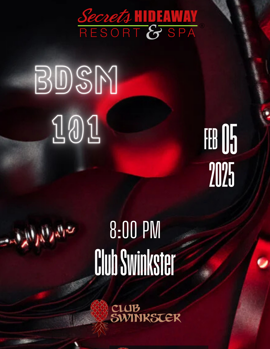 Join Club Swinkster™ tonight at 8pm for BDSM 101, your ultimate ticket to exploring the thrilling world of bondage, discipline, dominance, submission, and so much more! Designed to be fun and flirty, this course will guide you through the core principles of consent, communication, and safety, all while stoking your passion for new, exciting experiences. Whether you're brand new to kink or looking to refresh your skills, our inviting environment encourages curiosity, empowerment, and boundary-pushing in the best possible ways.