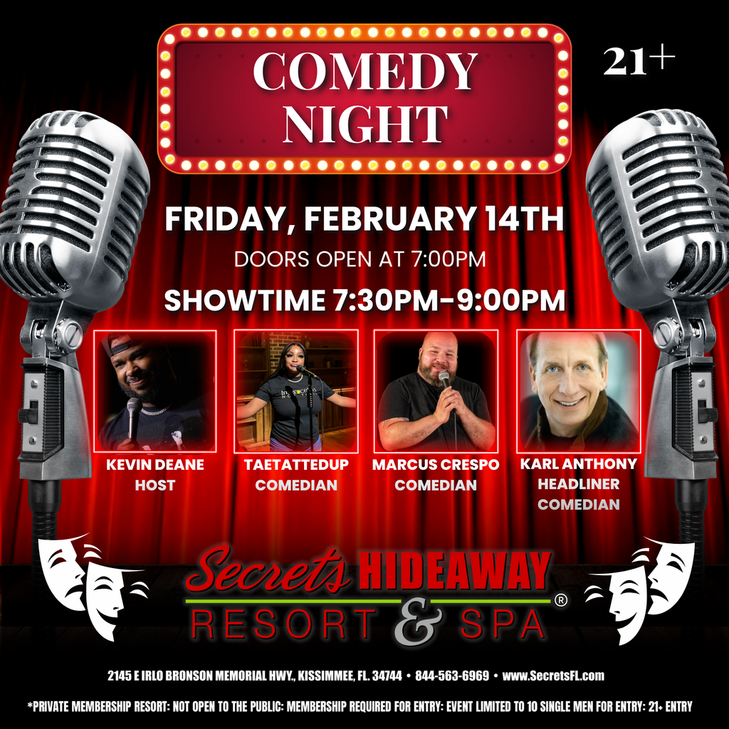 Tonight, join us at Club Secret for a comedy show from 7:30pm to 9pm that promises to deliver side-splitting laughter and unforgettable entertainment. Your host, Kevin Dean "Mr 407", will lead an uproarious lineup featuring headliner Karl Anthony, along with the hilarious talents of Tae Tattedup and Marcus Crespo, ensuring an evening packed with witty banter and nonstop humor.