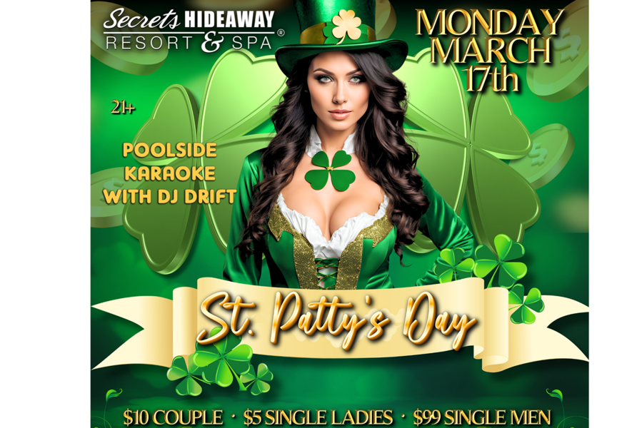 This is your opportunity to let loose, showcase your singing talents, or cheer on others as they take the stage, all while enjoying themed decorations and special St. Patty's Day cocktails crafted by our expert bartenders. Whether you're a karaoke veteran or a first-timer, the night is sure to be filled with laughter, music, and memorable moments. Wear a touch of green and bring your best Irish cheer to Secrets Hideaway for a St. Patty's Day filled with song, celebration, and maybe a little bit of Irish luck!