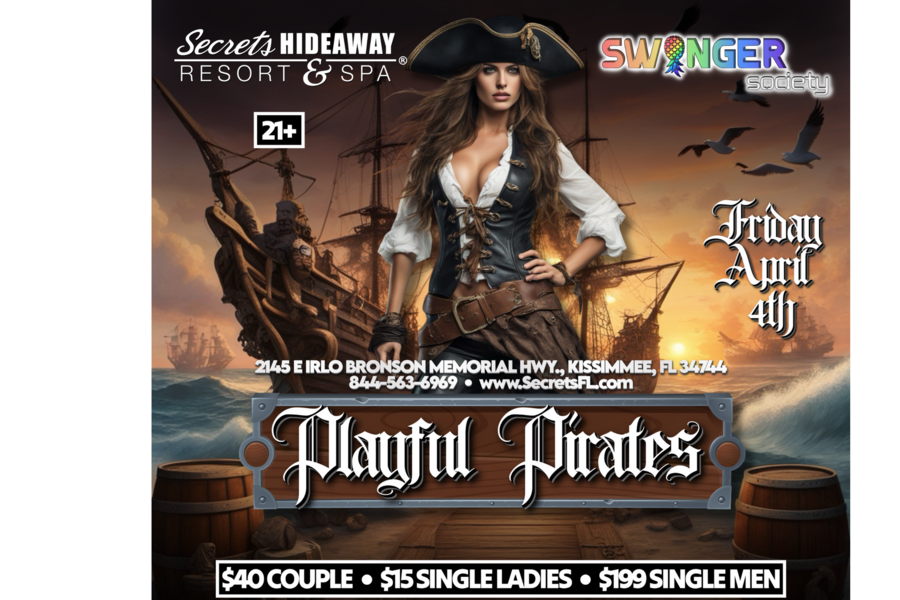 Swingers Society presents the "Playful Pirates" event on Friday, April 4th at Secrets Hideaway. Get ready to set sail into a world of high-seas seduction, where you can channel your inner buccaneer and embrace the thrill of adventure. Dress in your sexiest pirate attire, don those eye patches and bandanas, and get ready to pillage the night with like-minded swashbucklers. This event promises a playful atmosphere brimming with flirtation, laughter, and the spirited energy that makes the lifestyle community so special.